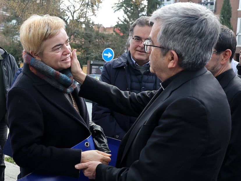 Pié foto: El arzobispo Luis Argüello, tras ser elegido presidente de la Conferencia Episcopal Española en marzo de 2024, saluda a Paula Alonso-Pimentel, víctima de abusos en la Iglesia y vieja conocida.