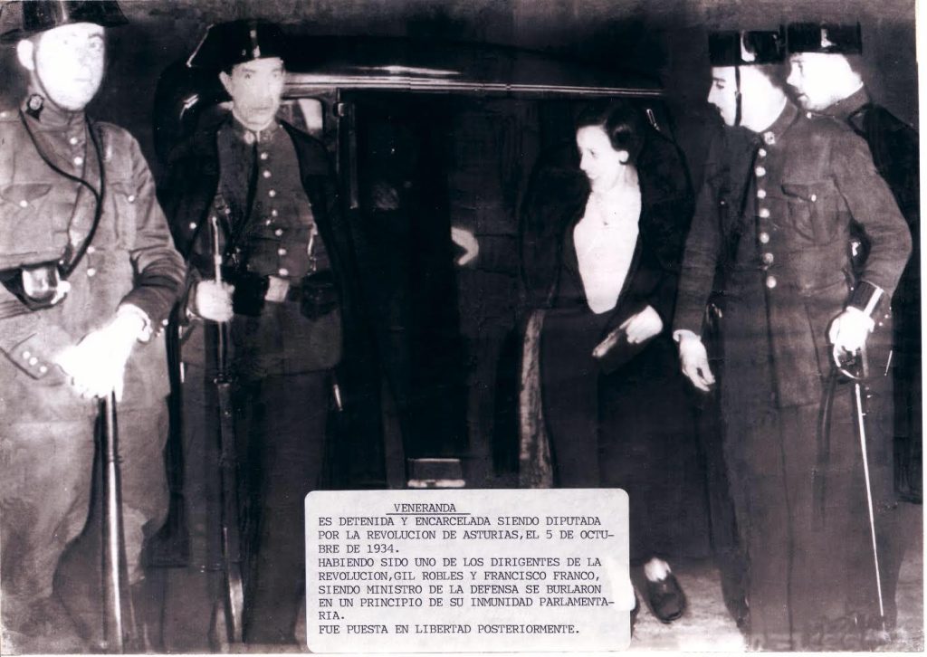 En la entrevista a Veneranda que realiza Elena Aub, en 1980, tanto ésta como ella afirman literalmente que fué detenida en 1934, en Gijón, en casa de unos amigos y que estuvo detenida cerca de un mes: